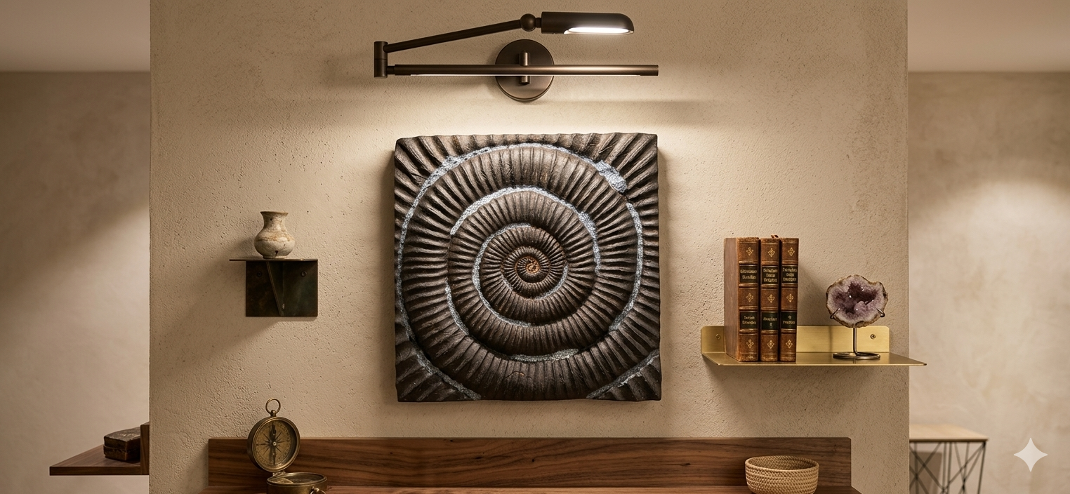 Einzigartiges Design: Die spiralförmige Ammonit-Struktur symbolisiert Unendlichkeit und Harmonie – perfekt als zentraler Blickfang an jeder Wand.