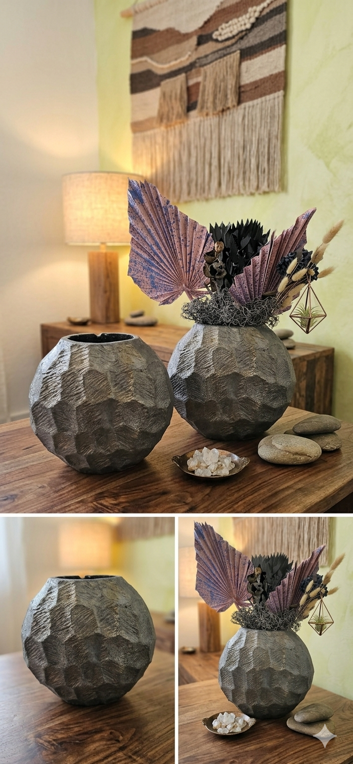 Exklusives Vaser-Set "Vulcano" – Handgefertigte Stein-Optik in Anthrazit mit getrocknetem Deko-Bouquet