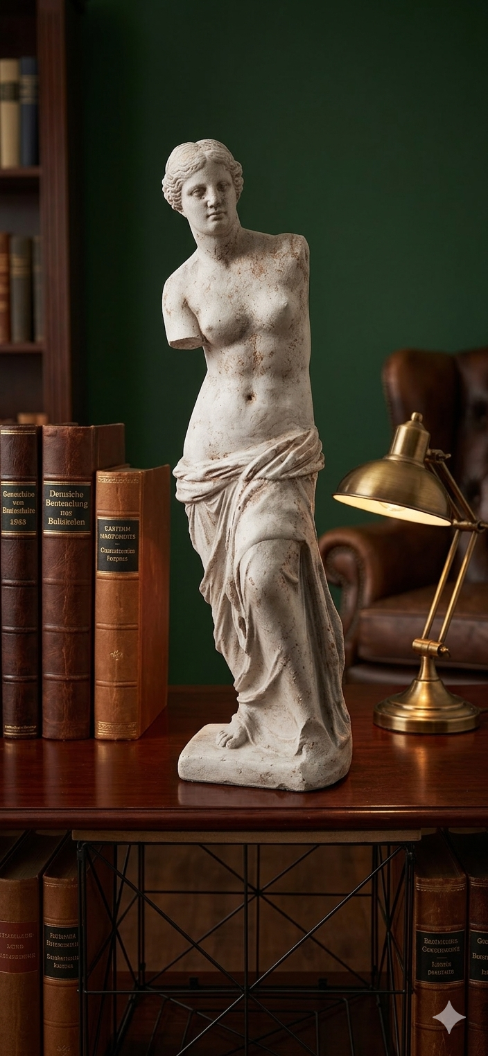 Diese detailgetreue Nachbildung der berühmten Aphrodite (Venus de Milo) verkörpert zeitlose Schönheit und feminine Eleganz. Mit einer beeindruckenden Höhe von 47 cm ist diese Büste nicht nur ein Deko-Objekt, sondern ein echtes Statement-Piece, das jedem Raum eine intellektuelle und luxuriöse Note verleiht. Das authentische Antik-Finish gibt der Statue den Charakter eines wertvollen Fundstücks aus einer anderen Zeit.