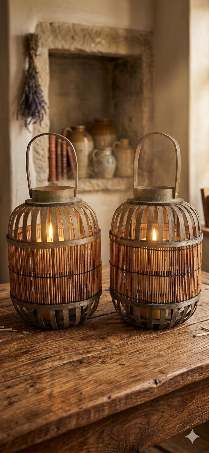 Exklusives Windlicht-Set aus Bambus mit Glaseinsatz – Rustikale Laterne für Gemütliches Licht – 40 cm hoch – Boho & Landhaus Stil – Braun